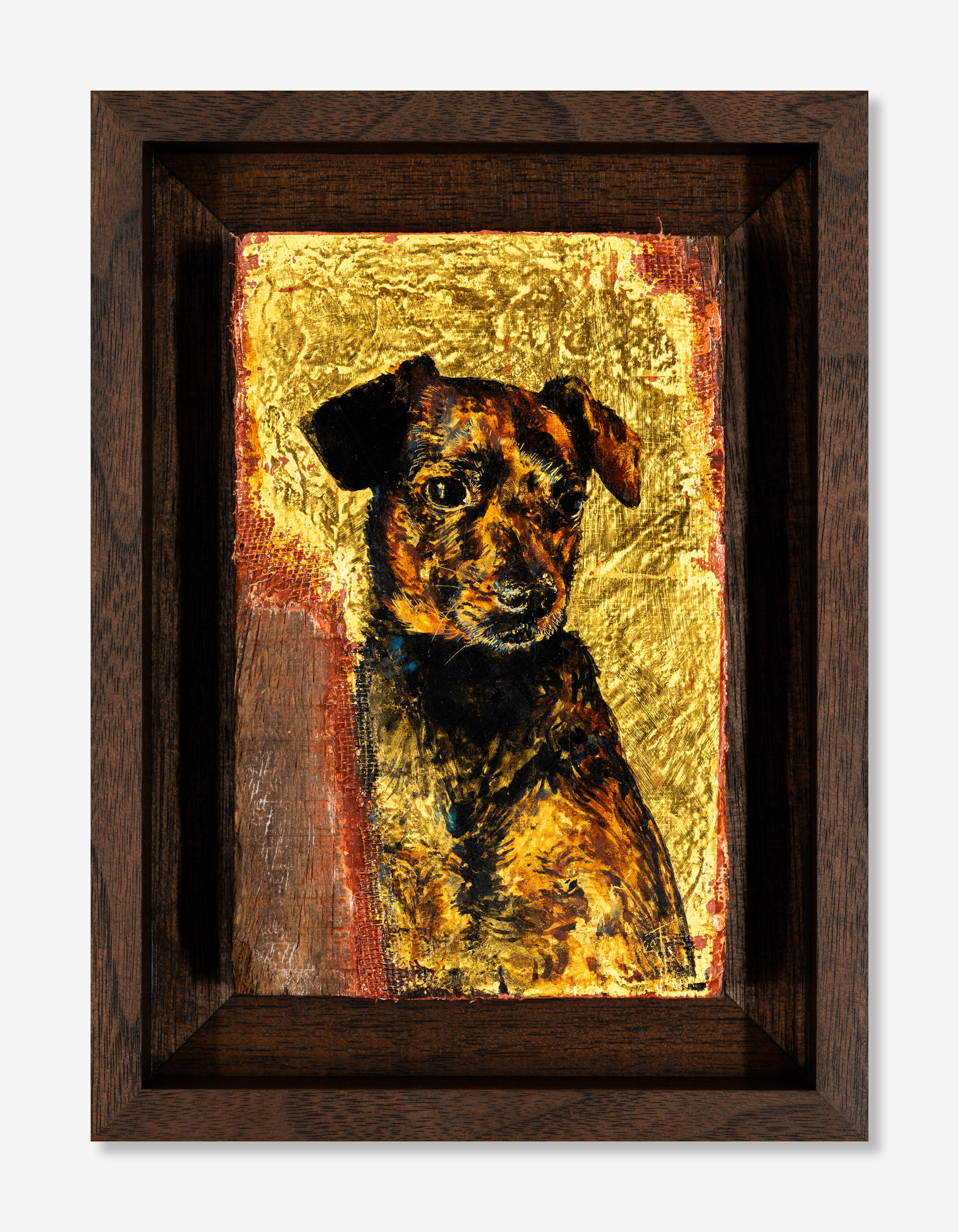 Denna underbara lilla målning är gjord på en tjock träbit. Den förestället en hund och som troligtvis är målad med oljefärg och sedan förgylld med riktigt guld.